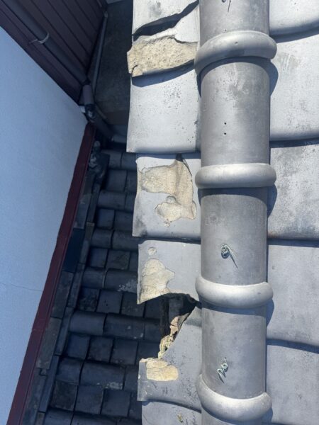 現地調査を行うと、ケラバ部分の瓦が落下しており、周辺の瓦にもひび割れや欠けが多数見られました。