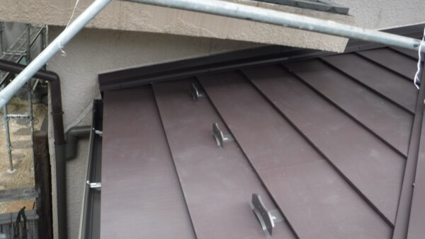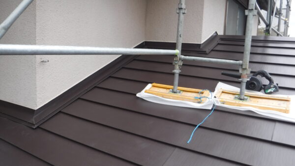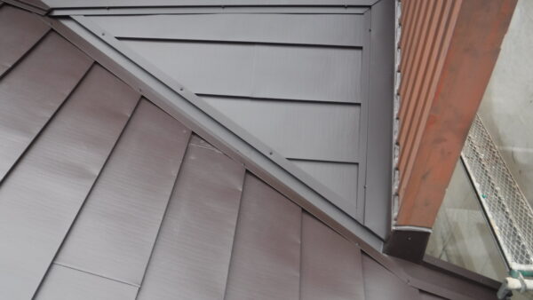 その集まった雨水を軒先の雨樋まで流すための「谷板金」を設置しました。